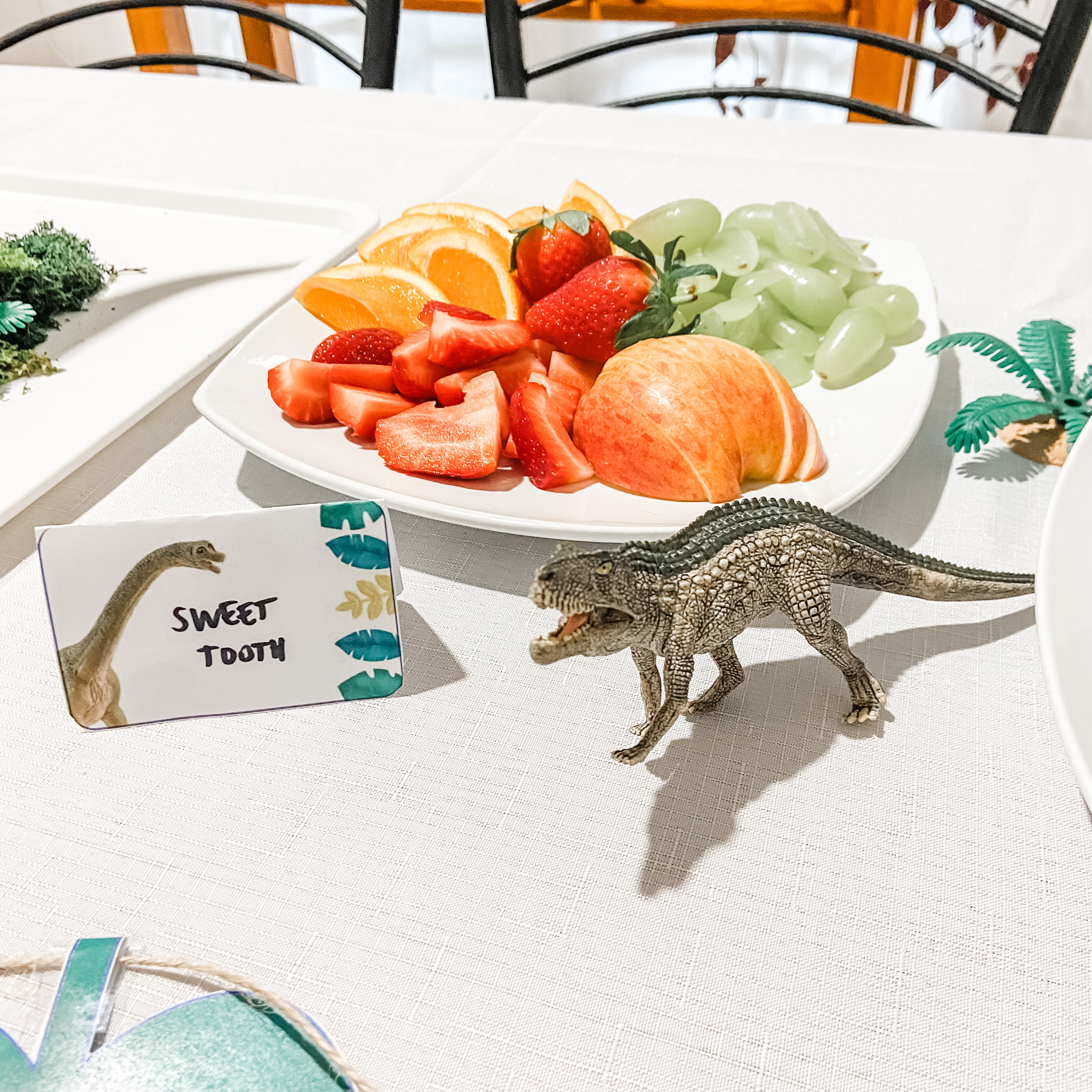 - Foldable place cards for name tags, food labels, games or other party organisation (showcasing a Brachiosaurus, Plesiosaurus, and T-Rex)
