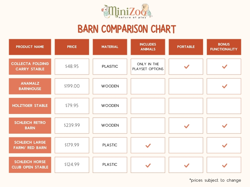 Choosing the perfect barn or stable for your MiniZoo animal figurines can feel a little overwhelming. There are multiple options, all with different offerings, so which is best? Will the AnamalZ Wooden Barnhouse fit Schleich farm animals? How many animals can fit in the CollectA Folding Stable?