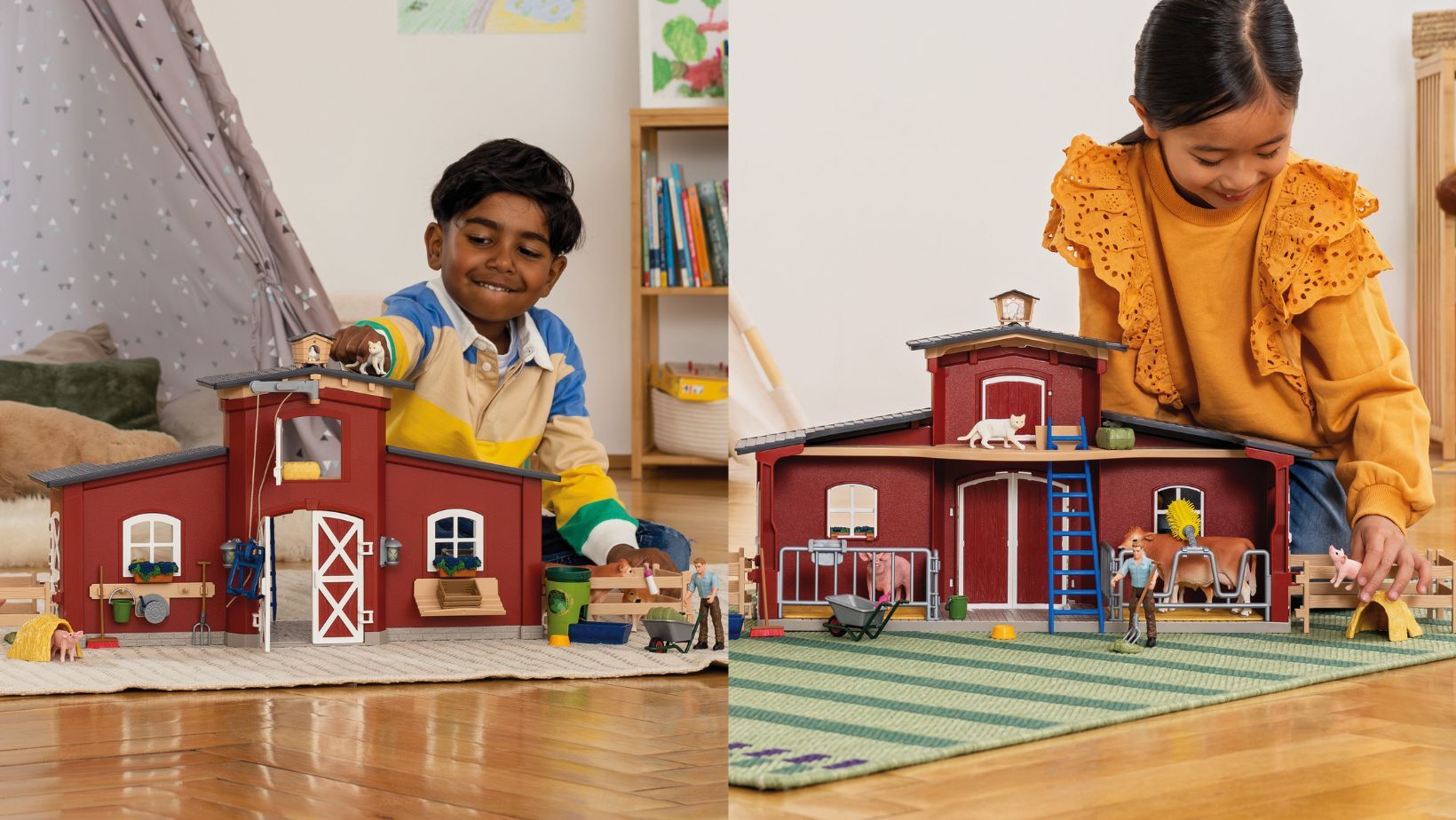 If you want something incredibly fun for extended imaginative play, the Schleich Large Farm House is a dream gift. It’s part barn, part farmhouse, combining a home setting with an open barn area, hay loft, fences and more. It includes 2 people figurines, furniture, a few animals and classic Schleich accessories. Like the other plastic Schleich barns, the Farm House needs to be assembled before play.