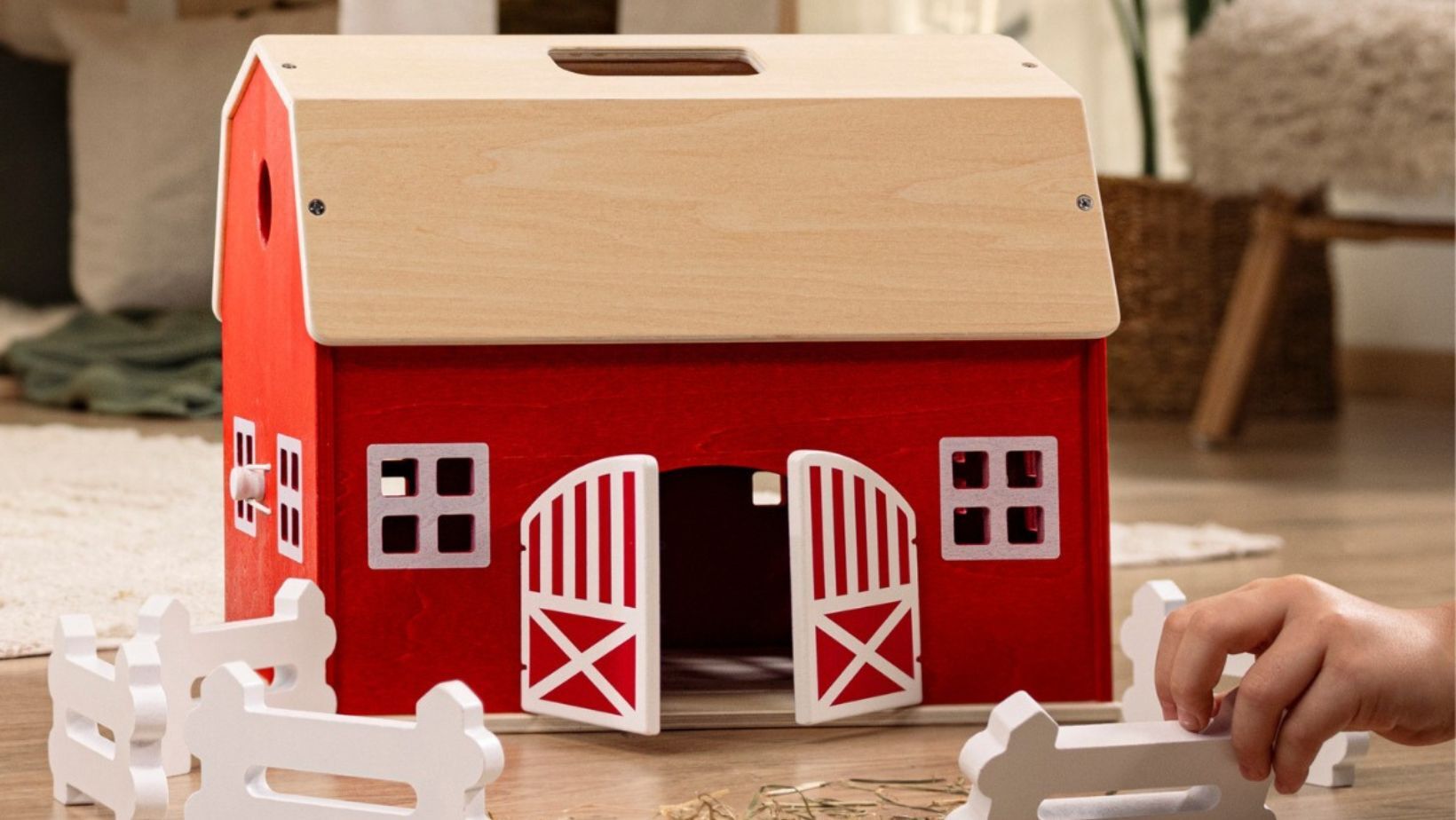 This wooden set needs assembling before play. Instructions are simple to follow and assembly is easy. Watch me unbox and put together this Barnhouse on TikTok here.