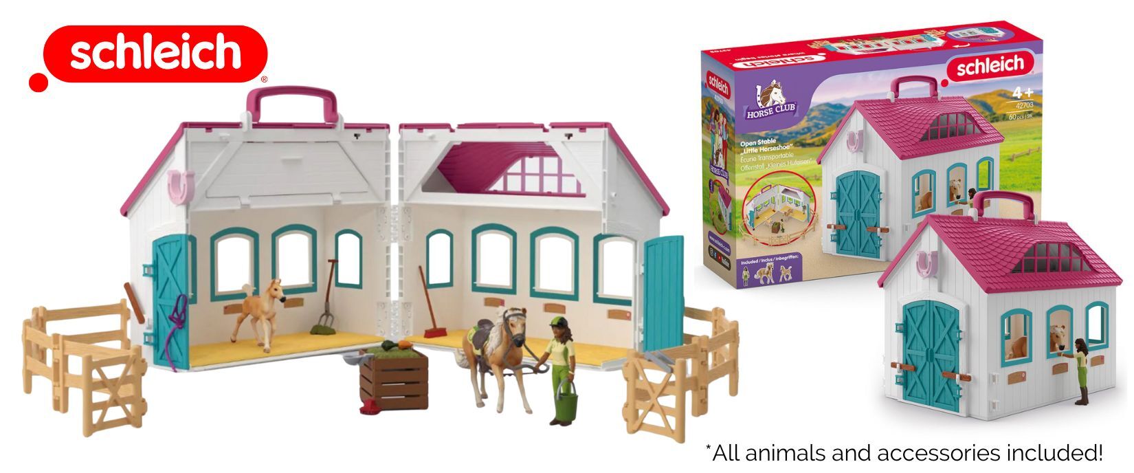 This new Schleich stable has Horse Club charm written all over it, combining white walls with soft blue windowsills and a pink roof. It’s designed like a carry case with a top handle, and includes a rider, horse, foal and accessories. Like other plastic Schleich stables, this needs assembling before play, but it's not as challenging to put together as the others, so you could gift it straight from the box.
