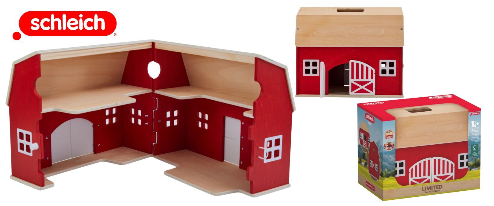 This nostalgic, beautifully designed wooden barn brings a more traditional feel to farm play in a beautiful red colour, with white trims and a raw wooden roof. The Schleich Retro Barn has a fold-out design with a handy built-in carry handle on the roof. It is quite heavy though, so not as easy for little ones to move around. This wooden Schleich barn comes as is, so no assembly is required! It also comes with white wooden fence pieces.