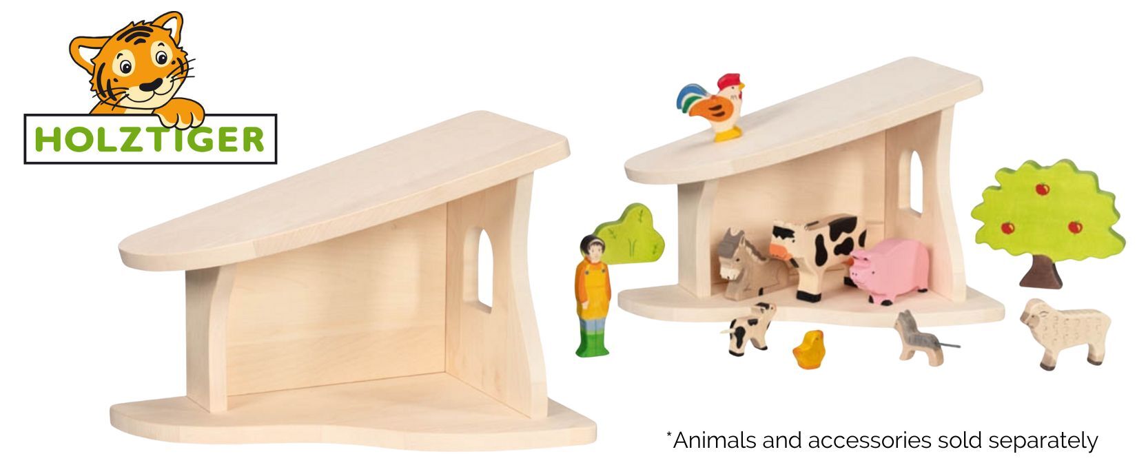 This gorgeous hardwood structure is a simple, open style building with three walls and a window. While it’s perfect for Holztiger and other wooden figures, it also fits Schleich and CollectA farm animal figurines comfortably.